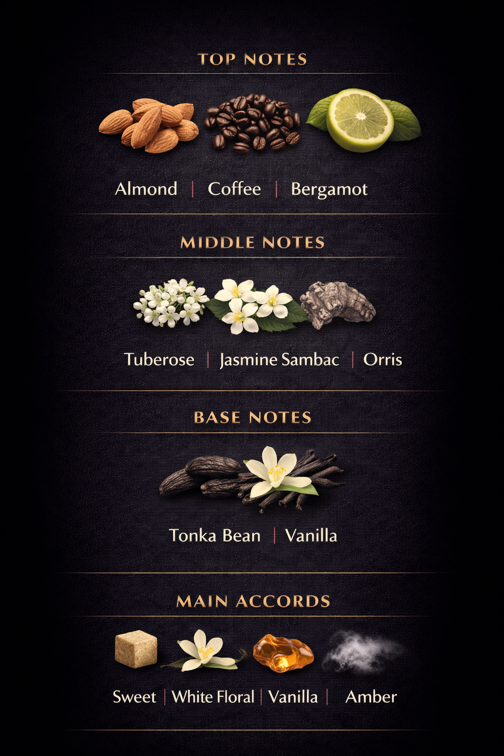 Base Notes: Amber, Musk, Vanilla